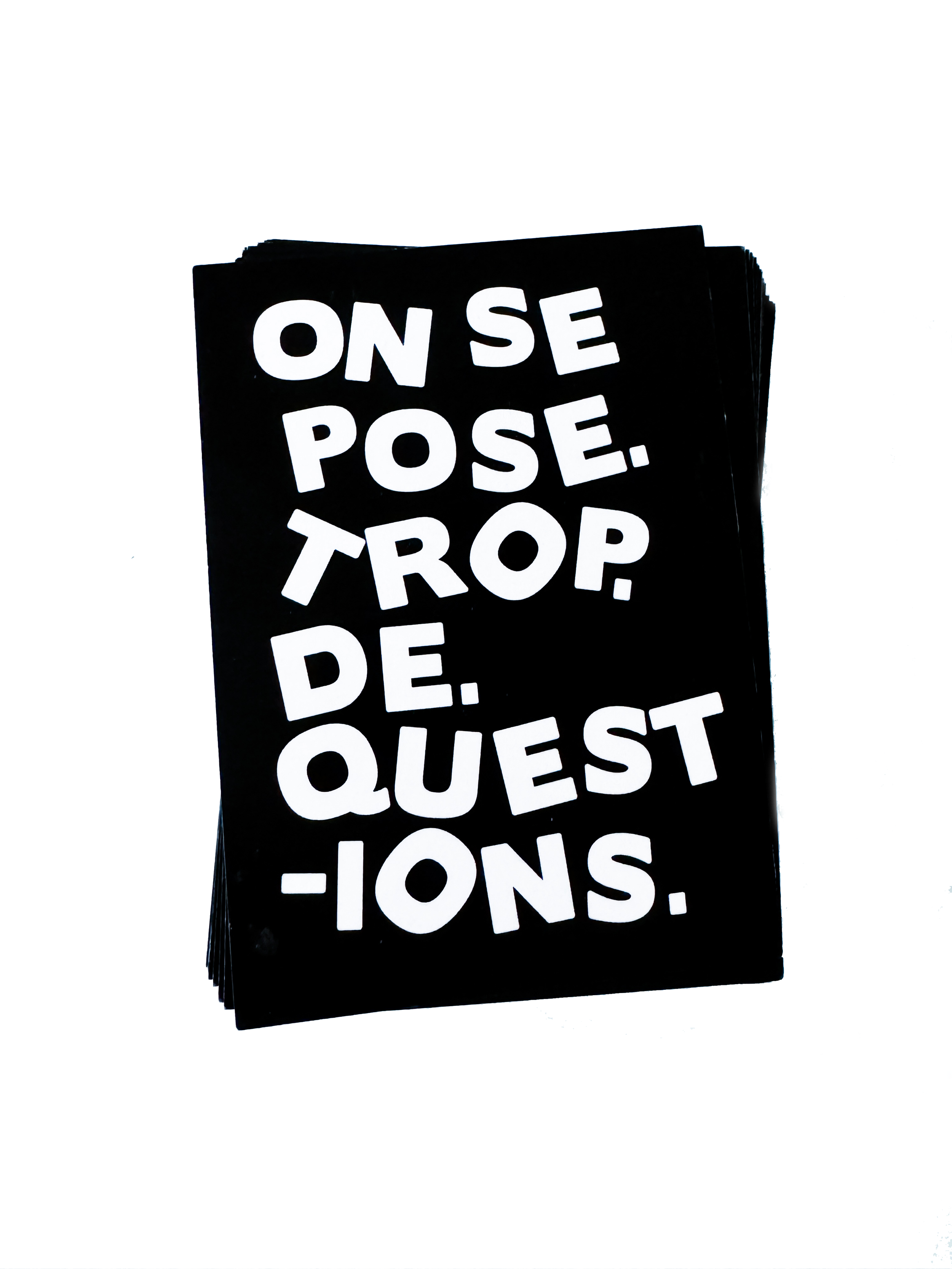 “On se pose trop de questions” est un collectif “socio-créatif” qui développe plusieurs axes de travail complémentaires et qui partage une vision commune, celle du “Deviens ce que tu veux être”. Notre démarche est holistique en questionnant la place de l’individu dans la société et son pouvoir d’agir et de s’exprimer.